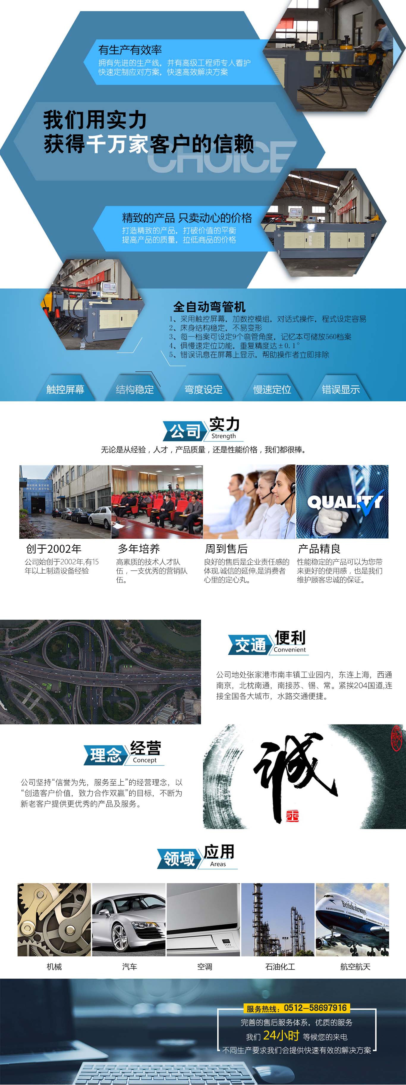 張家港市雙和機械制造有限公司始建于2001年,占地面積12000平方米,南鄰蘇州、無錫、上海,東鄰常州、南京,交通便利,位長三角中間地段,風景優(yōu)美的張家港。 雙和公司至創(chuàng)立開始,引進了國外的設計制造理念,組建了企業生產管理優(yōu)秀團隊,致力于管材加工機械研發(fā)、設計、制造。創(chuàng)新的設計理念,嚴格的質量把關,專業的售后服務,不斷提升了我在整個行業的影響力。 雙和公司生產的系列產品分為彎管機、切管機、縮管機、磨齒機、伺服彎管機、數控彎管機、液壓彎管機、自動切管機、管端成型機、倒角機、大弧滾圓機、鋁切機、壓彎機等管材加工機械,廣泛用于航天業、造船業、汽車制造、鍋爐制造、自行車、摩托車、體育健身器材、管制品家...